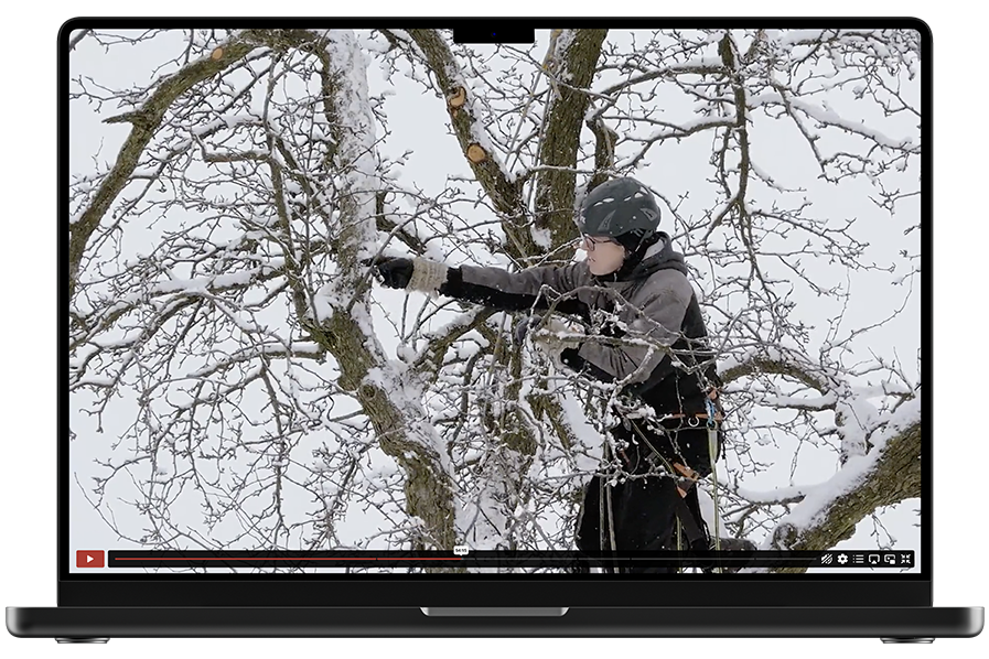 Řez velkého zasněženého stromu v době vegetačního klidu.